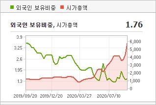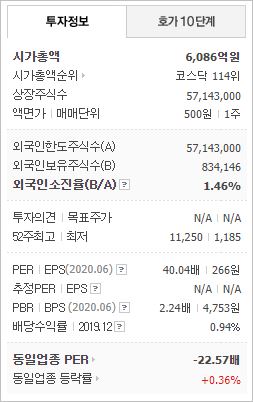 시가총액은 6,603억원으로 코스닥 92위에 위치하고 있으며, 외국인소진율은 1.32% 입니다. 2020년 기준, ROE 13.21%, PER 31.48배, PBR 4.29배이며, 아직까지 배당은 없었습니다.