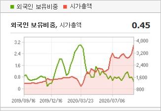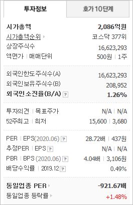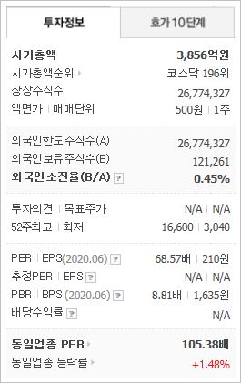 시가총액은 3,856억원으로 코스닥 196위이며, 외국인소진율은 0.45% 입니다. 2019년 기준, ROE 15.1배, PER 25.72배, PBR 3.63배이며, 배당은 없었습니다.