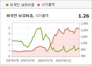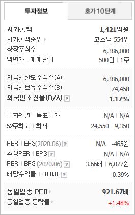 시가총액은 1,421억원으로 코스닥 554위에 위치하고 있으며, 외국인소진율은 1.17% 입니다. 2020년 기준, ROE -2.26%, PER -84.75배, PBR 1.98배이며, 시가배당률은 0.65% 입니다.
