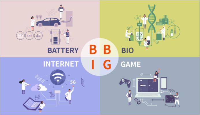 BBIG는 미래를 이끌어갈 가장 분야의 스펠링 앞부분만 따서 약자로 불리는 것입니다. 배터리(Battery) + 바이오(Bio) + 인터넷(Internet) + 게임(Game) 이렇게 4개의 산업군을 의미합니다.