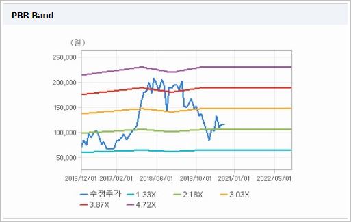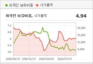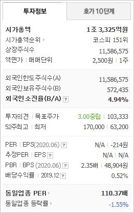 시가총액은 1조3,325억원으로 코스피 151위를 기록하고 있으며, 외국인소진율은 4.94% 입니다. 2020년 기준, ROE 5.3%, PER 40.55배, PBR 1.9배이며, 배당률(2019년 기준)은 0.44% 입니다.