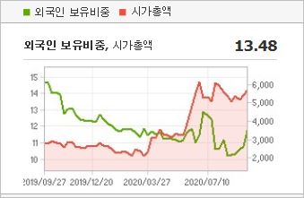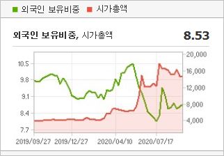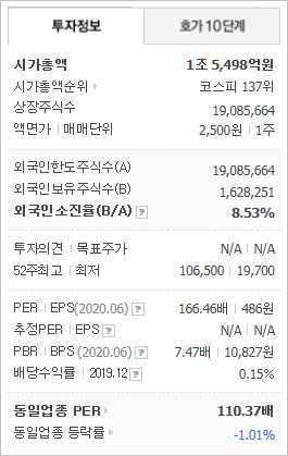 시가총액은 1조5,498억원으로 코스피 137위이며, 외국인소진율은 8.53% 입니다. 2019년 기준, ROE 5.2%, PER 44.11배, PBR 2.14배이며, 배당률은 0.53% 입니다.