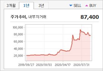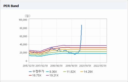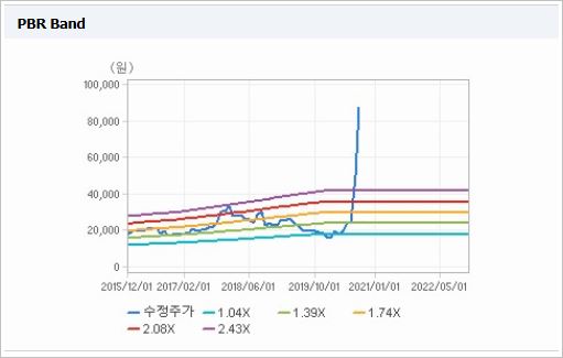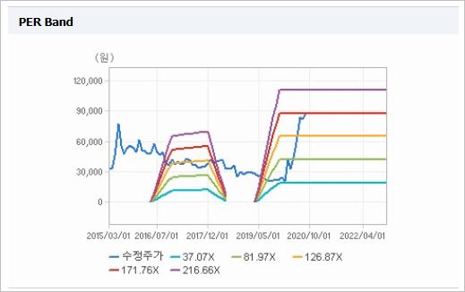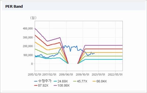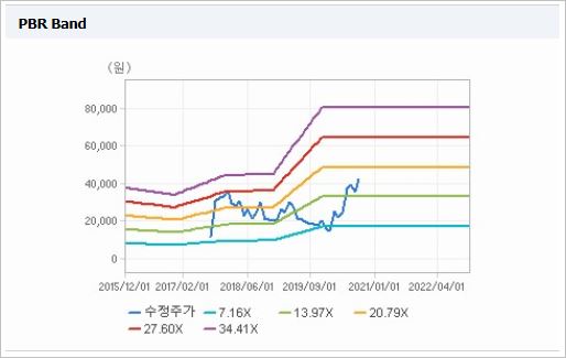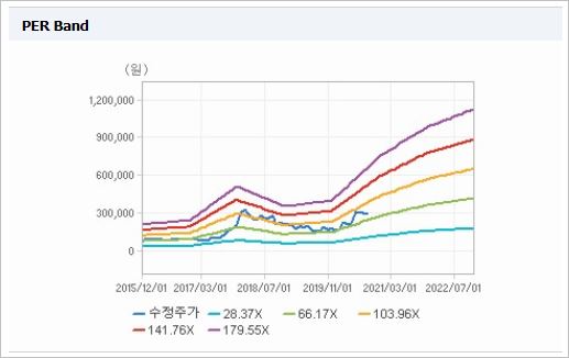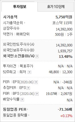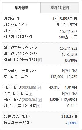 시가총액은 4조2,220억원으로 코스닥 6위를 기록하고 있으며, 외국인소진율은 8.14% 입니다. 2019년 기준, ROE 3.13%, PER 165.55배, PBR 5.08배이며, 배당은 없습니다.