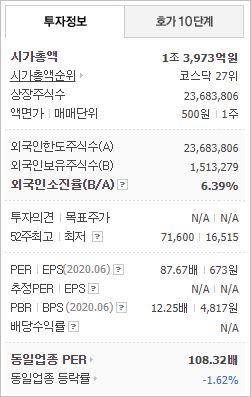 시가총액은 2조9,625억원으로 코스피 84위를 기록하고 있으며, 외국인소진율은 17.39% 입니다. 2020년 기준, ROE 4.81%, PER 57.73배, PBR 2.66배이며, 배당(2019년 기준)은 0.75% 입니다.