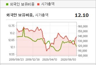 시가총액은 12조9,995억원으로 코스피 25위를 기록하고 있으며, 외국인소진율은 12.1% 입니다. 2020년 기준, ROE 7.07%, PER 29.08배, PBR 2.01배이며, 배당률(2019년 기준)은 1.23% 입니다.