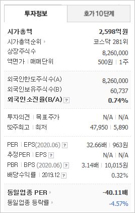 시가총액 3,274억원으로 코스닥 216위를 기록하고 있으며, 외국인소진율은 0.56% 입니다. 2019년 기준, ROE 15.31%, PER 21.97배, PBR 3.11배이며, 배당은 없습니다.
