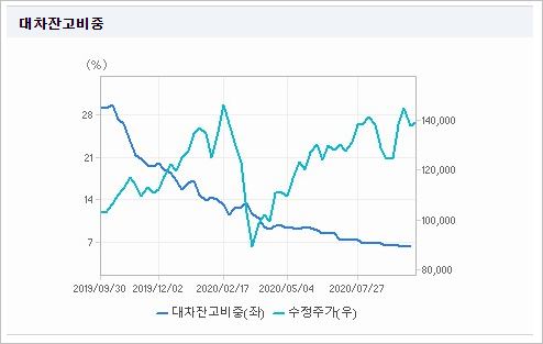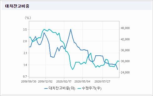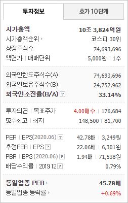 시가총액 10조3,824억원으로 코스피 30위이며, 외국인소진율은 33.14% 입니다. 2020년 6월 기준, PER 42.78배, EPS 3,249원, PBR 1.94배, BPS 71,538원이며, 배당수익률(2019.12)은 0.79% 입니다.