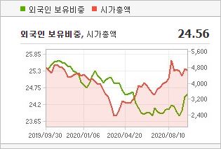 시가총액 4,682억원으로 코스피 298위를 기록하고 있으며, 외국인소진율은 24.56% 입니다. 2020년 6월 기준, PER 12.64배, EPS 3,556원, PBR 0.64배이며, 배당수익률(2019.12)은 1.56% 입니다. 급등주 수혜주