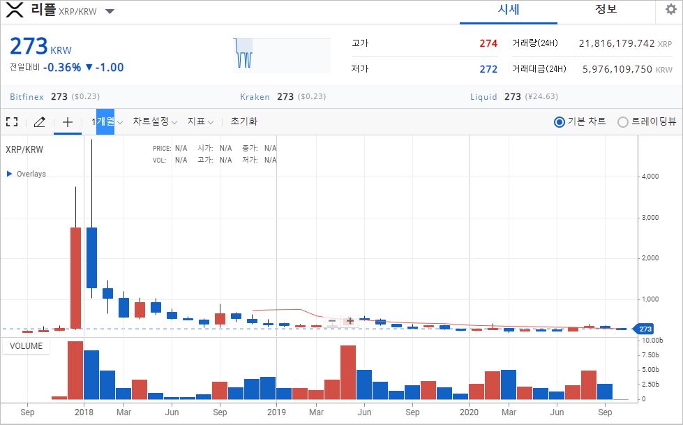 리플은 2017년말 가상화폐 열풍시기, 3천원을 호가하였었습니다. 2019년 부터 현재까지 200~300원대 박스피에서 크게 벗어나지 못하는 모습입니다.
