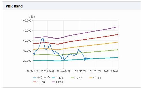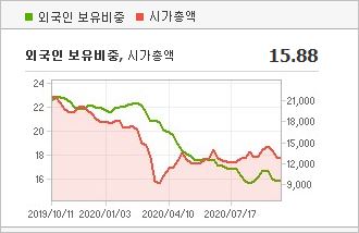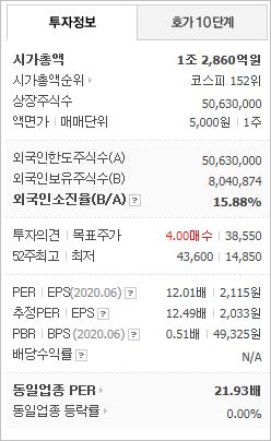 시가총액 1조2,860억원으로 코스피 152위이며, 외국인소진율은 15.88% 입니다. 2020년 6월 기준, PER 12.01배, EPS 2,115원, PBR 0.51배이며 배당수익률은 없습니다.