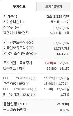 시가총액 2조2,224억원으로 코스피 103위에 위치하고 있으며, 외국인소진율은 14.12% 입니다. 2020년 6월 기준, PER 14.22배, EPS 1,603원, PBR 1.81배이며, 배당수익률(2019.12)은 1.75% 입니다.