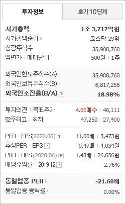 시가총액 1조3,717억원으로 코스닥 29위이며, 외국인소진율은 18.98% 입니다. 2020년 6월 기준, PER 11배, EPS 3,473원, PBR 1.43배이며, 배당수익률(2019.12)DMS 2.76% 입니다.