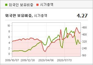 시가총액 2,074억원으로 코스닥 367위를 기록하고 있으며, 외국인소진율은 1.23% 입니다. 2020년 6월 기준, PER 103.43배, EPS 70원, PBR 4.57배이며, 배당수익률은 없습니다.