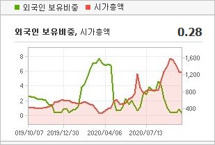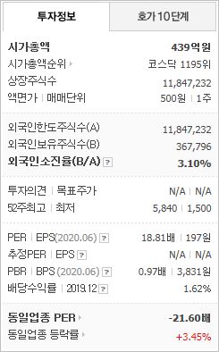 시가총액 602억원으로 코스닥 1032위이며, 외국인소진율은 1.23% 입니다. 2020년 6월 기준, EPS -118원, PBR 0.57배, BPS 3,537원이며, 배당수익률은 없습니다.