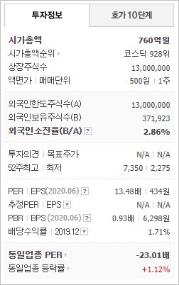 시가총액 760억원으로 코스닥 928위를 기록하고 있으며, 외국인소진율은 2.86% 입니다. 2020년6월 기준, PER 13.48배, EPS 434원, PBR 0.93배, BPS 6,298원이며, 배당수익률(2019.12)은 1.71% 입니다.