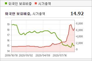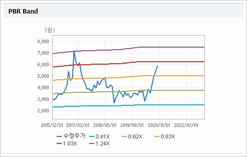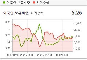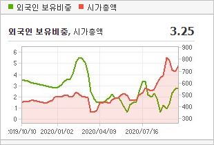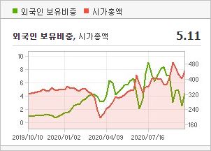 시가총액 7,179억원으로 코스닥 79위를 기록하고 있으며, 외국인소진율은 14.99% 입니다. 2020년 6월 기준, PBR 8.9배, BPS 694원이며, 배당수익률은 없습니다.