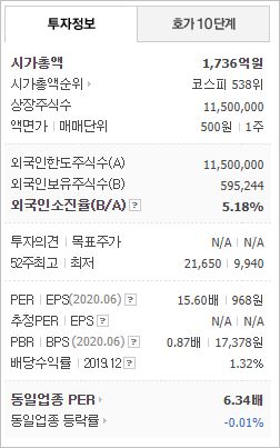 시가총액 1,736억원으로 코스피 538위에 위치하고 있으며, 외국인소진율은 5.18% 입니다. 2020년 6월 기준, PER 15.6배, EPS 968원, PBR 0.87배이며, 배당수익률(2019.12)은 1.32% 입니다.