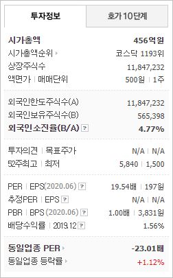 시가총액 456억원으로 코스닥 1193위를 기록하고 있으며, 외국인소진율은 4.77% 입니다. 2020년 6월 기준, PER 19.54배, EPS 197원, PBR 1배, BPS 3,831원이며, 배당수익률(2019.12)은 1.56% 입니다.