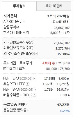 시가총액 3조9,287억원으로 코스피 63위를 기록하고 있으며, 외국인소진율은 35.38% 입니다. 2020년 6월 기준, PER 17.17배, EPS 9,660원, 배당수익률(2019.12)은 0.18% 입니다.