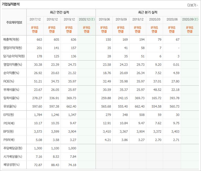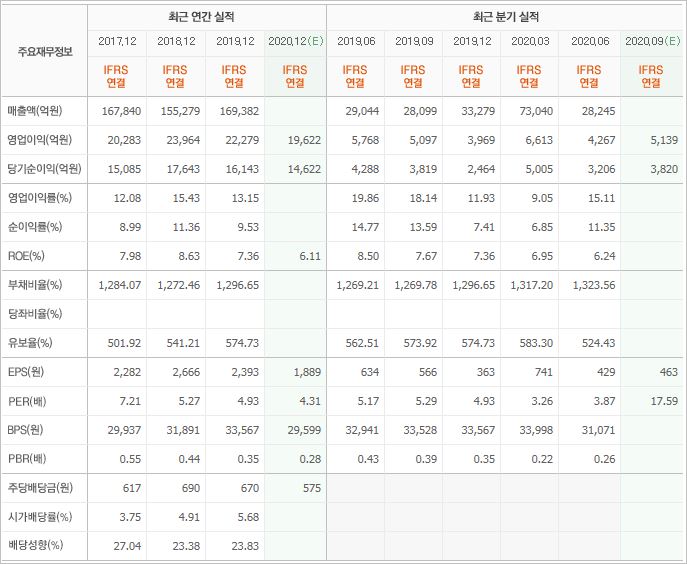 주당배당금은 매년 5,200원이 나오고 있으며, 2020년 역시 똑같은 금액이 책정될 것으로 예측됩니다. 유보율이 높은 반면, 부채비율이 300%가 넘는 부분은 고려해보아야 할 사항입니다.