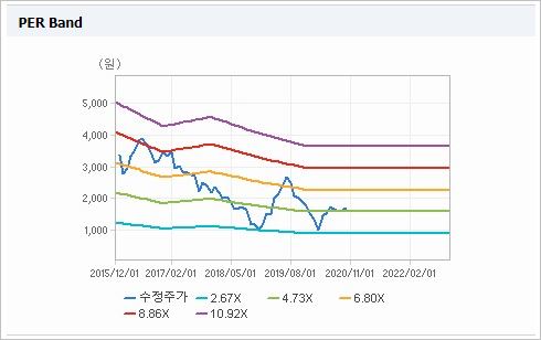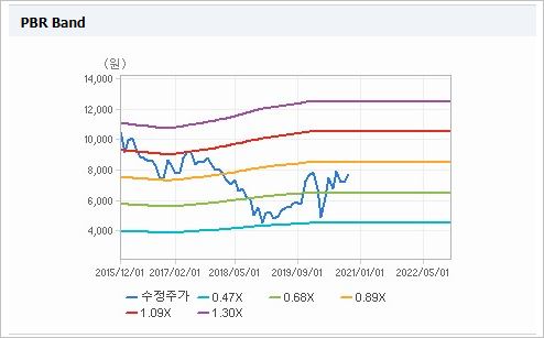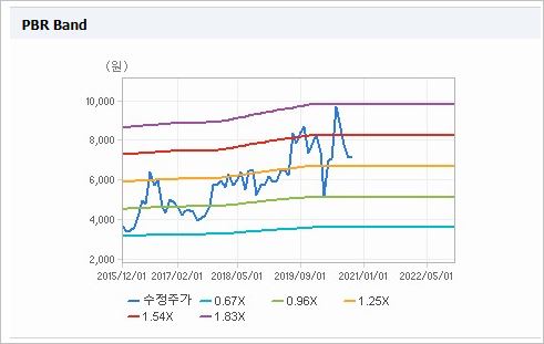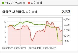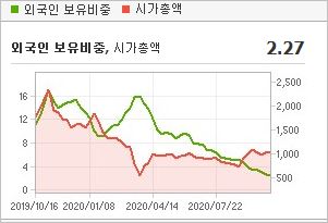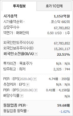 시가총액 449억원으로 코스닥 1203위를 기록하고 있으며, 외국인소진율은 3.58% 입니다. 2020년 6월 기준, PBR 0.74배, BPS 4,657원이며, 배당수익률은 없습니다.