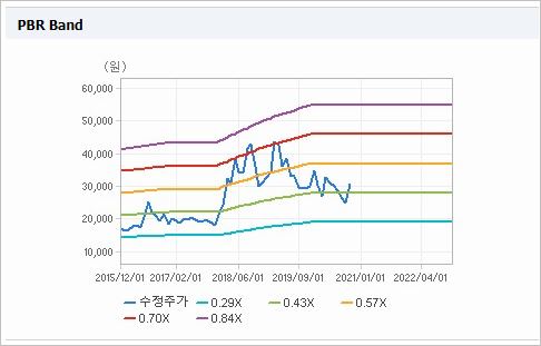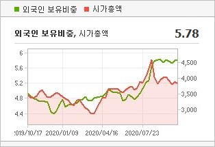 시가총액 3,794억원으로 코스피 341위를 기록하고 있으며, 외국인소진율은 5.8% 입니다. 2020년 6월 기준, PER 15.61배, PBR 1.11배이며, 배당수익률(2019.12)은 3.27% 입니다.