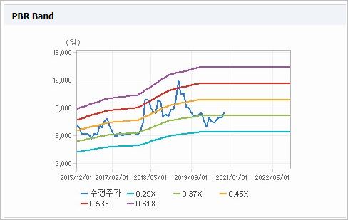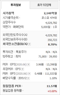 시가총액 2,140억원으로 코스피 474위이며, 외국인소진율은 8.7% 입니다. 2020년 6월 기준, PER 3.96배, PBR 0.48배이며, 배당수익률(2019.12)은 1.18% 입니다.