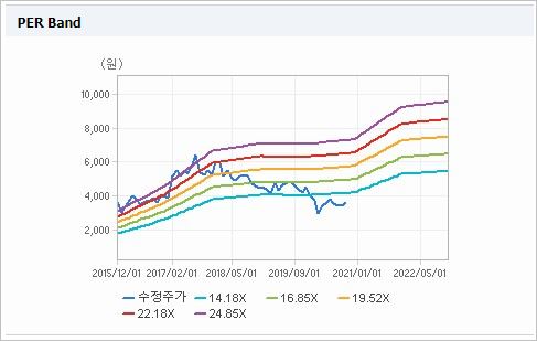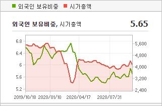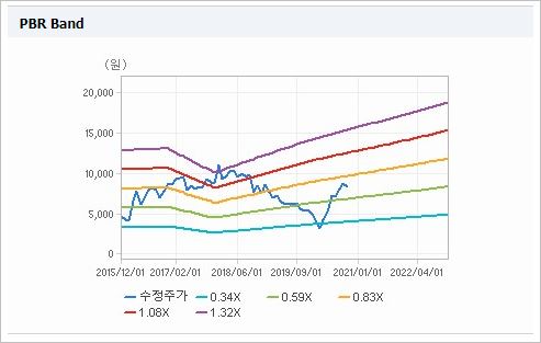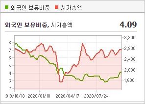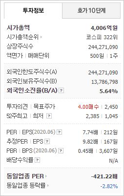 시가총액 4,006억원으로 코스피 322위를 기록하고 있으며, 외국인소진율은 5.64% 입니다. 2020년 6월 기준, PER 7.74배, PBR 0.45배이며, 배당수익률은 없습니다.