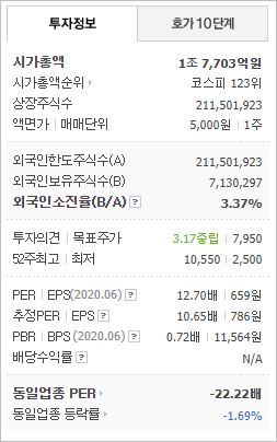 시가총액 1조7,703억원으로 코스피 123위를 기록하고 있으며, 외국인소진율은 3.37% 입니다. 2020년 6월 기준, PER 12.7배, PBR 0.72배이며, 배당수익률은 없습니다.