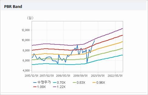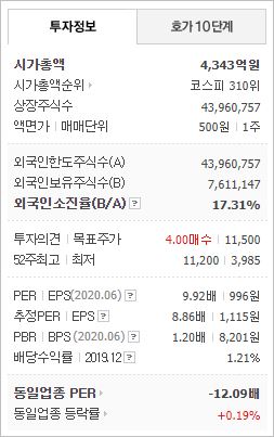 시가총액 4,343억원으로 코스피 310위를 기록하고 있으며, 외국인소진율은 17.31% 입니다. 2020년 6월 기준, PER 9.92배, PBR 1.2배이며, 배당수익률(2019.12)은 1.21% 입니다.