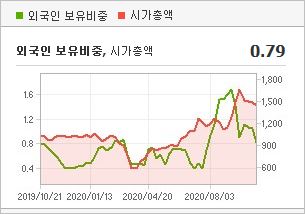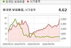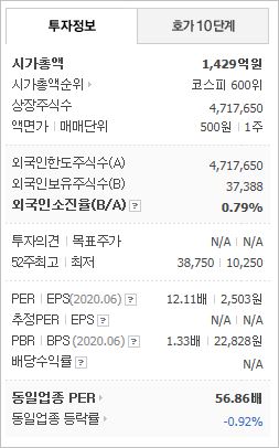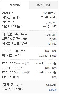 시가총액 1,510억원으로 코스닥 508위를 기록하고 있으며, 외국인소진율은 0.16% 입니다. 2020년 6월 기준, PER 12.10배, PBR 2.34배이며, 배당수익률은 없습니다.