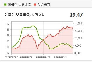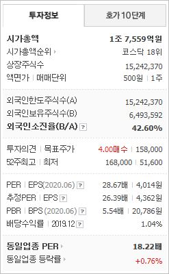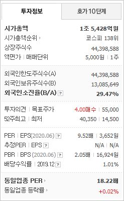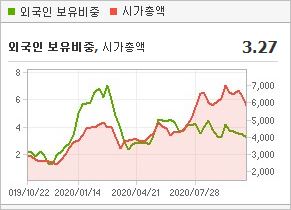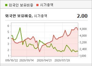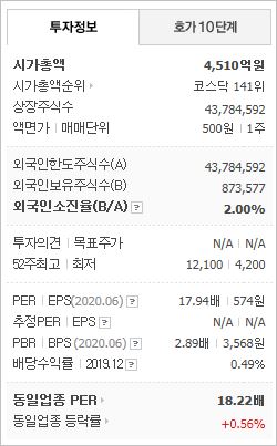 시가총액 4,142억원으로 코스닥 159위를 기록하고 있으며, 외국인소진율은 1.85% 입니다. 2020년 6월 기준, PER 16.48배(동일업종 PER 17.95배)이며, 배당수익률(2019.12)은 0.53% 입니다.
