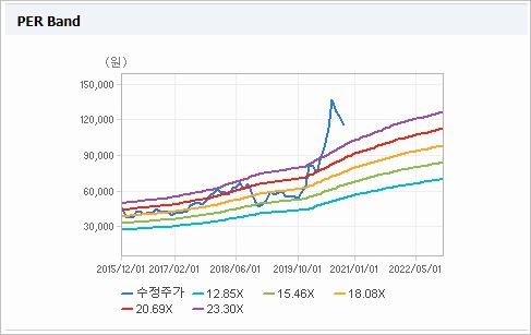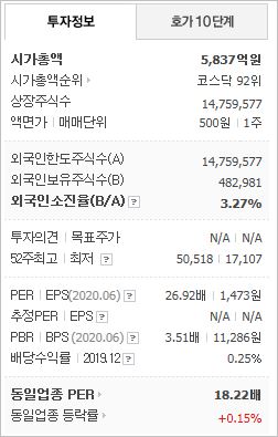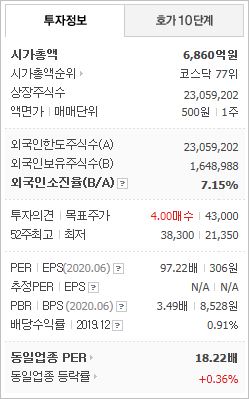 시가총액 6,618억원으로 코스닥 76위에 위치하고 있으며, 외국인소진율은 7.09% 입니다. 2020년 6월 기준, PER 93.79배(동일업종 17.95배), EPS 306원이며, 배당수익률(2019.12)은 0.94% 입니다.