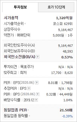 시가총액 1,320억원으로 코스피 629위를 기록하고 있으며, 외국인소진율은 0.53% 입니다. 2020년 6월 기준, PER 8.01배, PBR 0.32배이며, 배당수익률(2019.12)은 1.04% 입니다. 구제역 수혜주