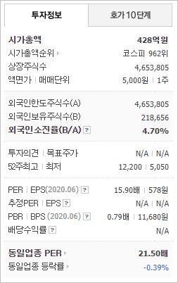 시가총액 428억원으로 코스피 962위를 기록하고 있으며, 외국인소진율은 4.7% 입니다. 2020년 6월 기준, PER 15.9배, PBR 0.79배이며, 배당수익률은 없습니다. 구제역 급등주