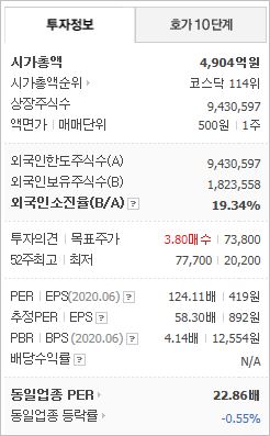 시가총액 4,904억원으로 코스닥 114위를 기록하고 있으며, 외국인소진율 19.34% 입니다. 2020년 6월 기준, PER 124.11배, PBR 4.14배이며, 배당수익률은 없습니다.