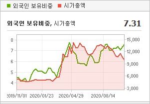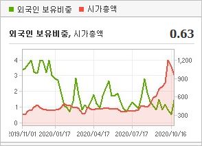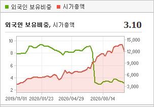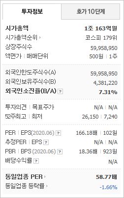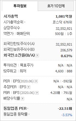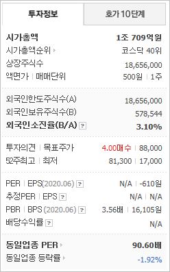 시가총액 1조709억원으로 코스닥 40위를 기록하고 있으며, 외국인소진율은 3.1% 입니다. 2020년 6월 기준, PBR 3.56배, BPS 16,105원이며, 배당수익률은 없습니다.