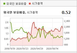 시가총약 1,721억원으로 코스닥 422위를 기록하고 있으며, 외국인소진율은 0.52% 입니다. 2020년 6월 기준, PER 27.52배, PBR 1.64배이며, 배당수익률(2019.12)은 0.47% 입니다.