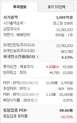 시가총액 3,909억원으로 코스피 328위를 기록 중에 있으며, 외국인소진율은 4.13% 입니다. 2020년 6월 기준, PER 11.5배, PBR 1.13배이며, 배당수익률(2019.12)은 0.97% 입니다.