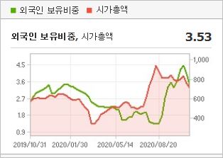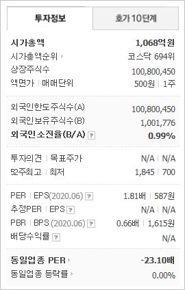 시가총액 1,068억원으로 코스닥 694위를 기록하고 있으며, 외국인소진율은 0.99% 입니다. 2020년 6월 기준, PER 1.81배, PBR 0.66배이며, 배당수익률은 없습니다.
