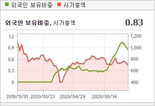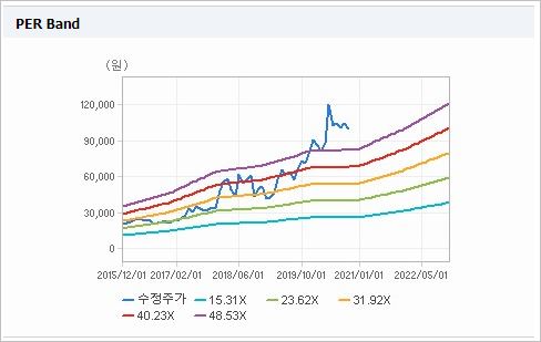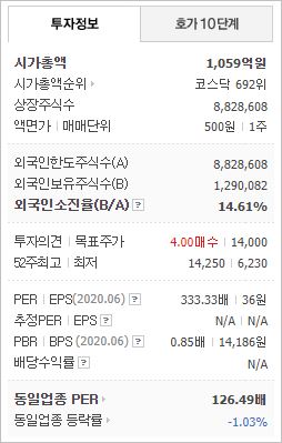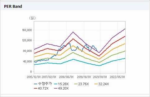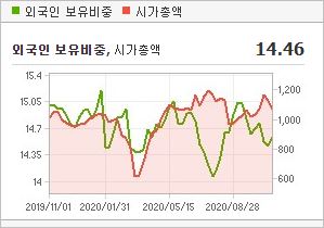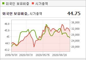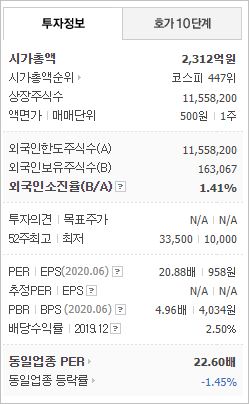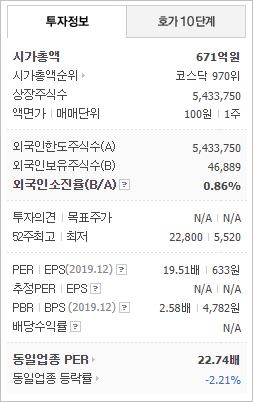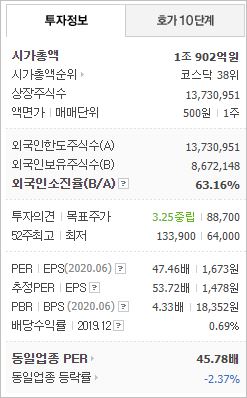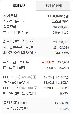 시가총액은 2조9,849억원으로 코스피 79위를 기록하고 있으며, 외국인소진율은 44.77% 입니다. 2020년 6월 기준, PER 62.23배, PBR 8.39배이며, 배당수익률(2019.12)은 0.47% 입니다.