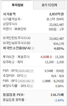시가총액 2,055억원으로 코스닥 354위를 기록하고 있으며, 외국인소진율은 4.05% 입니다. 2020년 6월 기준, PER 9.54배, PBR 1.08배이며, 배당수익률(2020.06)은 0.84% 입니다. OLED 관련주