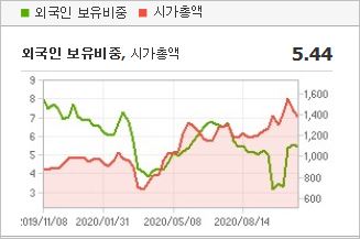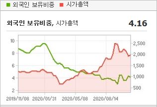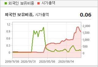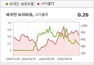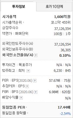 시가총액 1,606억원으로 코스닥 455위를 기록하고 있으며, 외국인소진율은 0.1% 입니다. 2020년 6월 기준, PER 57.67배, PBR 6.98배이며, 배당수익률은 없습니다. OLED 관련주