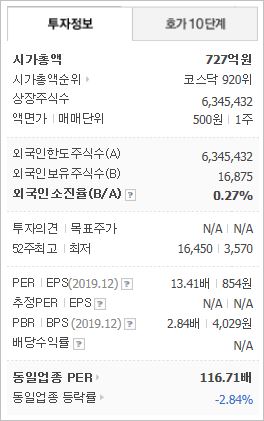 시가총액 727억원으로 코스닥 920위를 기록하고 있으며, 외국인소진율은 0.27% 입니다. 2019년 12월 기준, PER 13.41배, PBR 2.84배이며, 배당수익률은 없습니다. OLED 관련주