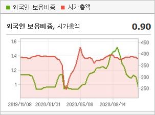 시가총액 348억원으로 코스피 1003위를 기록하고 있으며, 외국인소진율은 1.01% 입니다. 2020년 6월 기준, PER 37.42배, PBR 0.26배이며, 배당수익률(2019.12)은 0.43% 입니다.