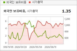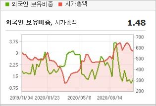시가총액 903억원으로 코스피 764위에 위치하고 있으며, 외국인소진율은 2.97% 입니다. 2020년 6월 기준, PER 43.78배, PBR 0.93배이며, 배당수익률은 없습니다.