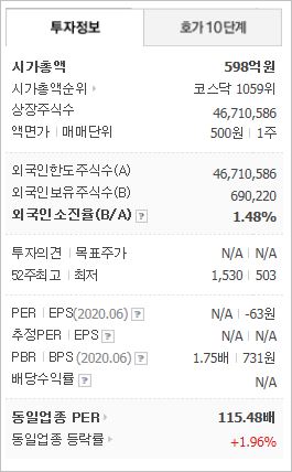 시가총액 598억원으로 코스닥 1059위를 기록하고 있으며, 외국인소진율은 1.48% 입니다. 2020년 6월 기준, PBR 1.75배, BPS 731원이며, 배당수익률은 없습니다. 탄소나노튜브 관련주