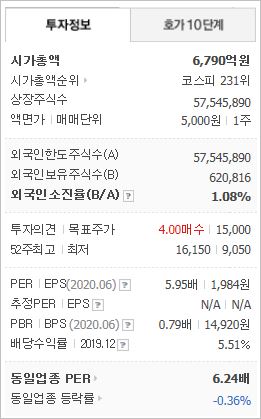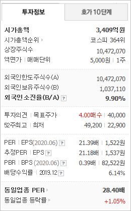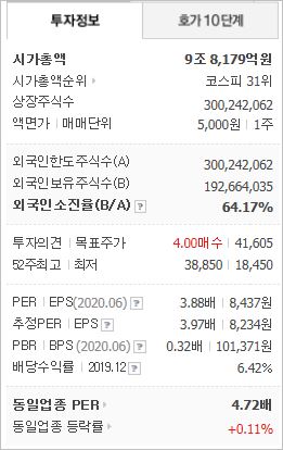 전년동기대비 매출액이 감소하고 영업이익이 적자로 전환하였으나 실적 회복의 조짐이 보이며, 동시에 회사채 발행으로 재무개선에 나간 점도 주목할만 합니다. 특히 매년 배당에 적극적인 기업이라 배당주로 매우 좋다 할 수 있습니다. 매년 4%대 상회한 배당률을 기록하고 있으며, 배당금은 주당 2천원입니다. 부채비율 112%, 유보율 1,578%