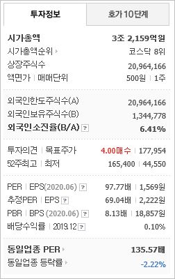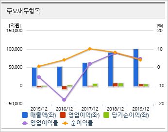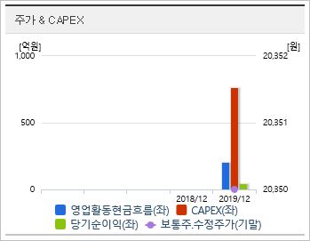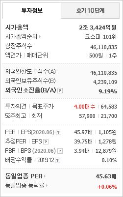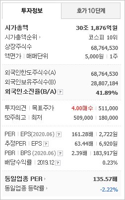 2020년 기준 ROE 3.89%, EPS 6,920원, PER 63.44배, BPS 190,573원, PBR 2.3배이며, 배당은 0.42로 매우 낮은 편입니다. 시총은 30조1,876억원으로 코스피 10위를 기록하고 있습니다.