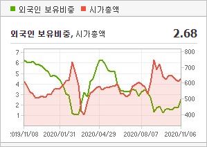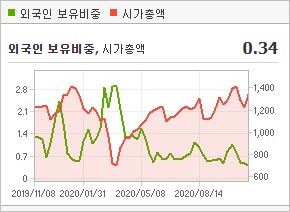 시가총액 875억원으로 코스피 780위를 기록하고 있으며, 외국인소진율은 2.02% 입니다. 2020년 6월 기준, PER 32.72배, PBR 0.86배이며, 배당수익률은 없습니다.
